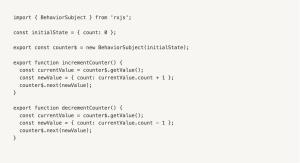In this example, we define an observable stream called counter$ using the BehaviorSubject class from the RxJS library. We also define two functions, incrementCounter and decrementCounter, which update the value of counter$. These functions are used to update the state of our application.