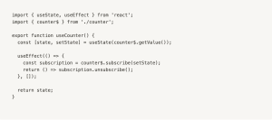 In this example, we define a custom hook called useCounter that subscribes to the counter$ observable stream and returns the latest value. We use the useState hook from React to manage state internally and the useEffect hook to subscribe to the counter$ stream and update the state when a new value is emitted. Finally, we return the current state from the hook.