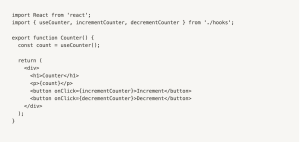 In this example, we import the useCounter hook and the incrementCounter and decrementCounter functions from our custom hook file. We use the useCounter hook to get the current value of the counter and the incrementCounter and decrementCounter functions to update the counter. Finally, we render the current value of the counter and two buttons to increment and decrement the value.
